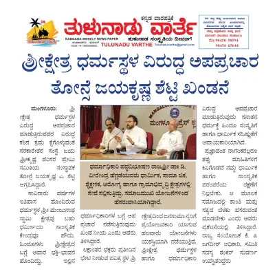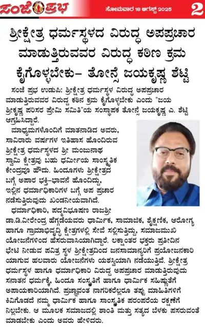 ಮಂಗಳೂರು : ಧರ್ಮಸ್ಥಳ ಕ್ಷೇತ್ರದ ಮೇಲೆ ಸ್ಥಾಪಿತ ಹಿತಾಶಕ್ತಿಗಳು ಅಪಪ್ರಚಾರ ಮಾಡುತ್ತಿರುವುದು ತೀವ್ರವಾಗಿ ತಿರಸ್ಕರಿಸಲಾಗಿದೆ. ಕ್ಷೇತ್ರದ ಬಗ್ಗೆ ಅಪಪ್ರಚಾರ ಮಾಡುವುದು ಸರಿಯಲ್ಲ. ನಿಖರವಾದ ತನಿಖೆಗಳು ನಡೆಯುತ್ತಿರುವಾಗ, ಸಾರ್ವಜನಿಕರಿಗೆ ತಪ್ಪು ಮಾಹಿತಿ ನೀಡುವುದು ಸರಿಯಲ್ಲ. ಕೊಲೆಯಾಗಿರಬಹುದು, ಆದರೆ ನೂರಾರು ಕೊಲೆಯಾಗಿದ್ದಲ್ಲಿ ನ್ಯಾಯ ವ್ಯವಸ್ಥೆ ಪೋಲೀಸರು ಇದ್ದಾರೆ, ಕೋರ್ಟುಗಳಿವೆ, ದೇಶದ ರಾಷ್ಟ್ರಪತಿ, ಪ್ರಧಾನ ಮಂತ್ರಿ ಹಾಗು ರಾಜ್ಯದ ಮುಖ್ಯ ಮಂತ್ರಿಗಳಿದ್ದಾರೆ ಎಂದು ಜಯಶ್ರೀಕೃಷ್ಣ ಪರಿಸರ ಪ್ರೇಮಿ ಸಮಿತಿಯ ಸಂಸ್ಥಾಪಕ ತೋನ್ಸೆ ಜಯಕೃಷ್ಣ ಎ. ಶೆಟ್ಟಿ ನುಡಿದರು.